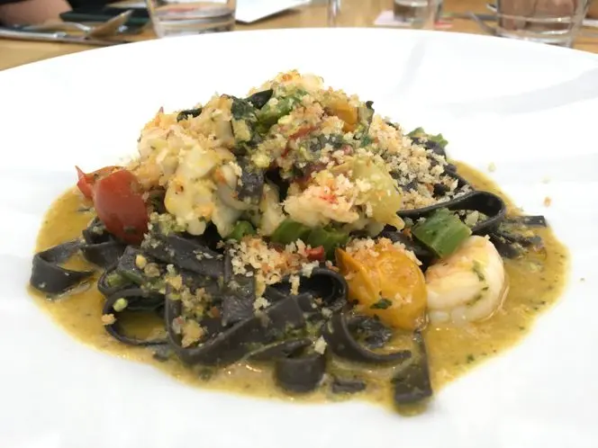 Lobster and prawn tagliatelle Nero (squid ink) is a decadent dish featuring pistachio green chili pesto.
