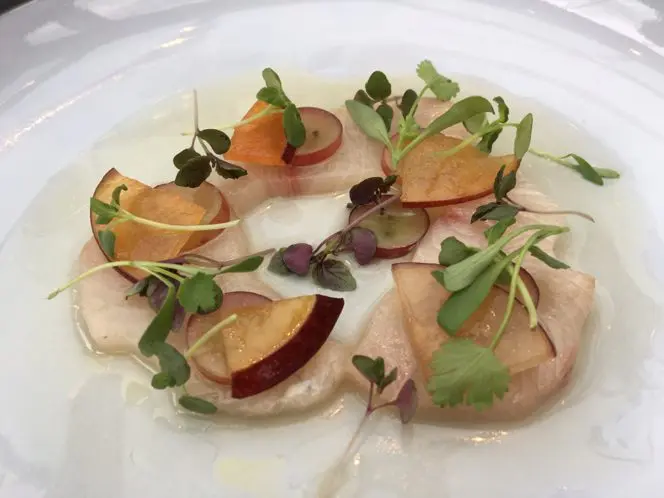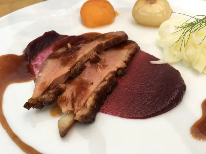 A roasted magret duck breast fully embraced the stone-fruit theme with lavender apricots, red cabbage plum purée, cipollini onions, and citrus duck jus. Duck works especially well when paired with stone fruit ingredients.