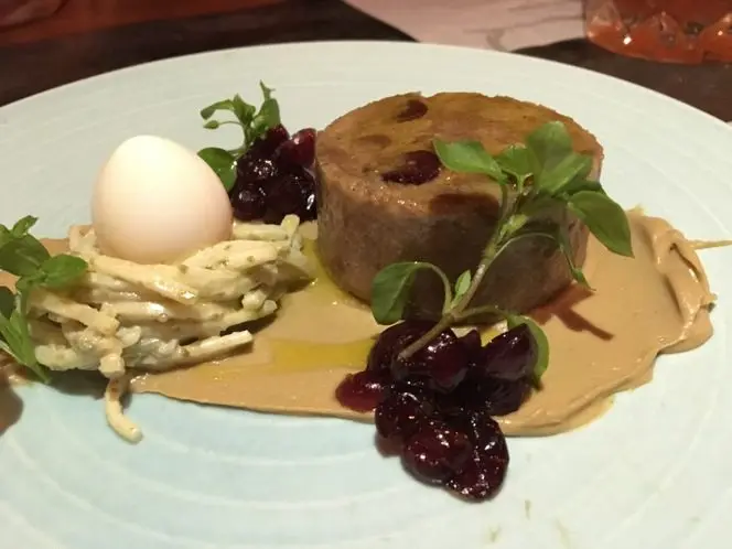 A goose terrine with celeriac remoulade, cranberries, porcini, and chickweed is lovely, especially when the quail egg is broken and the yolk spills out.