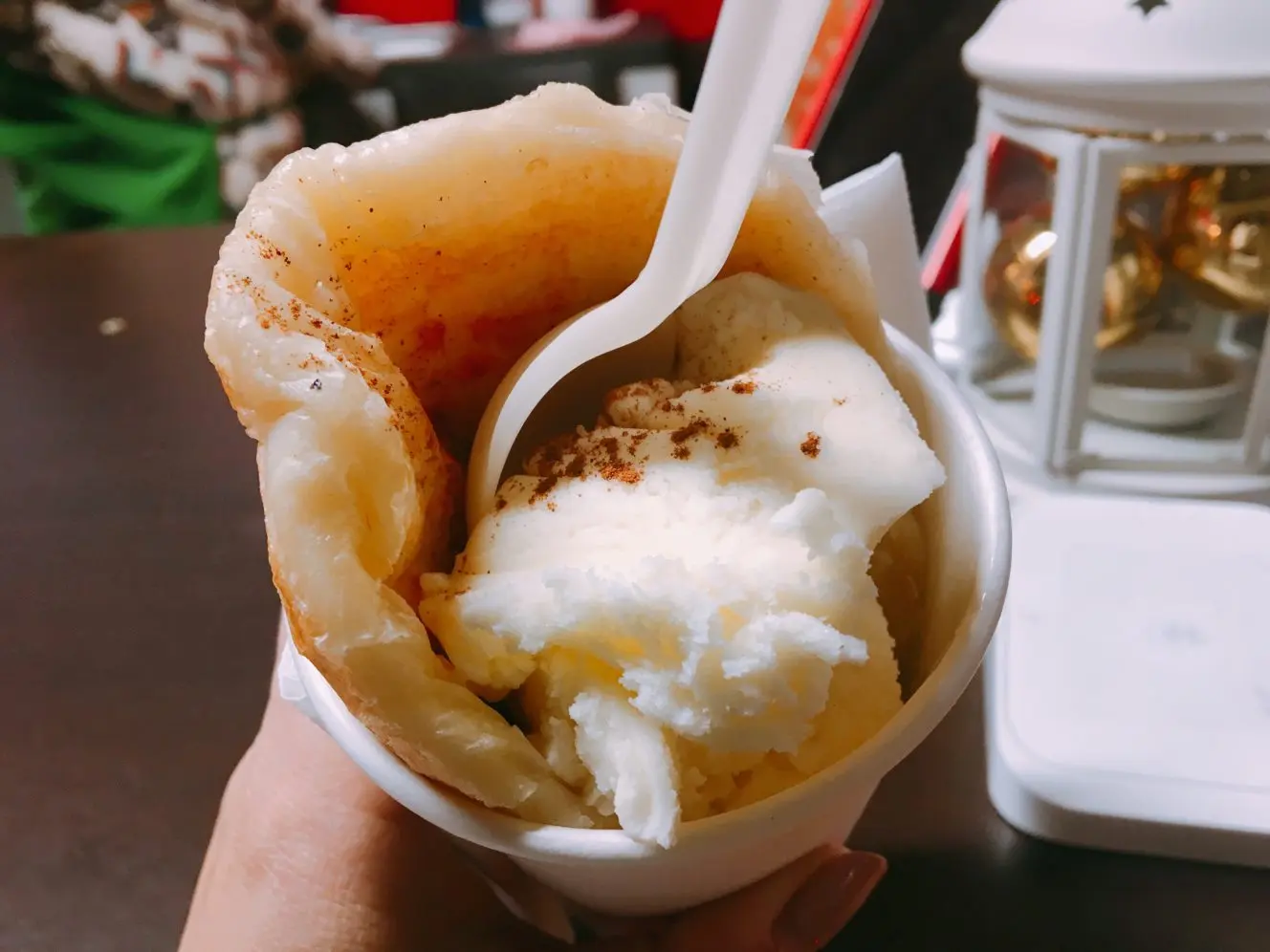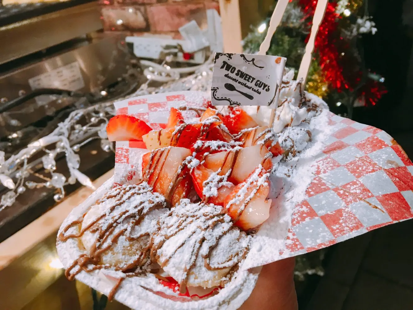 Mr. Hotcakes serves flaky pancakes stuffed with cinnamon and brown sugar. The pancake comes with either whipped cream or ice cream, the latter option creating the perfect hot/cold holiday treat.