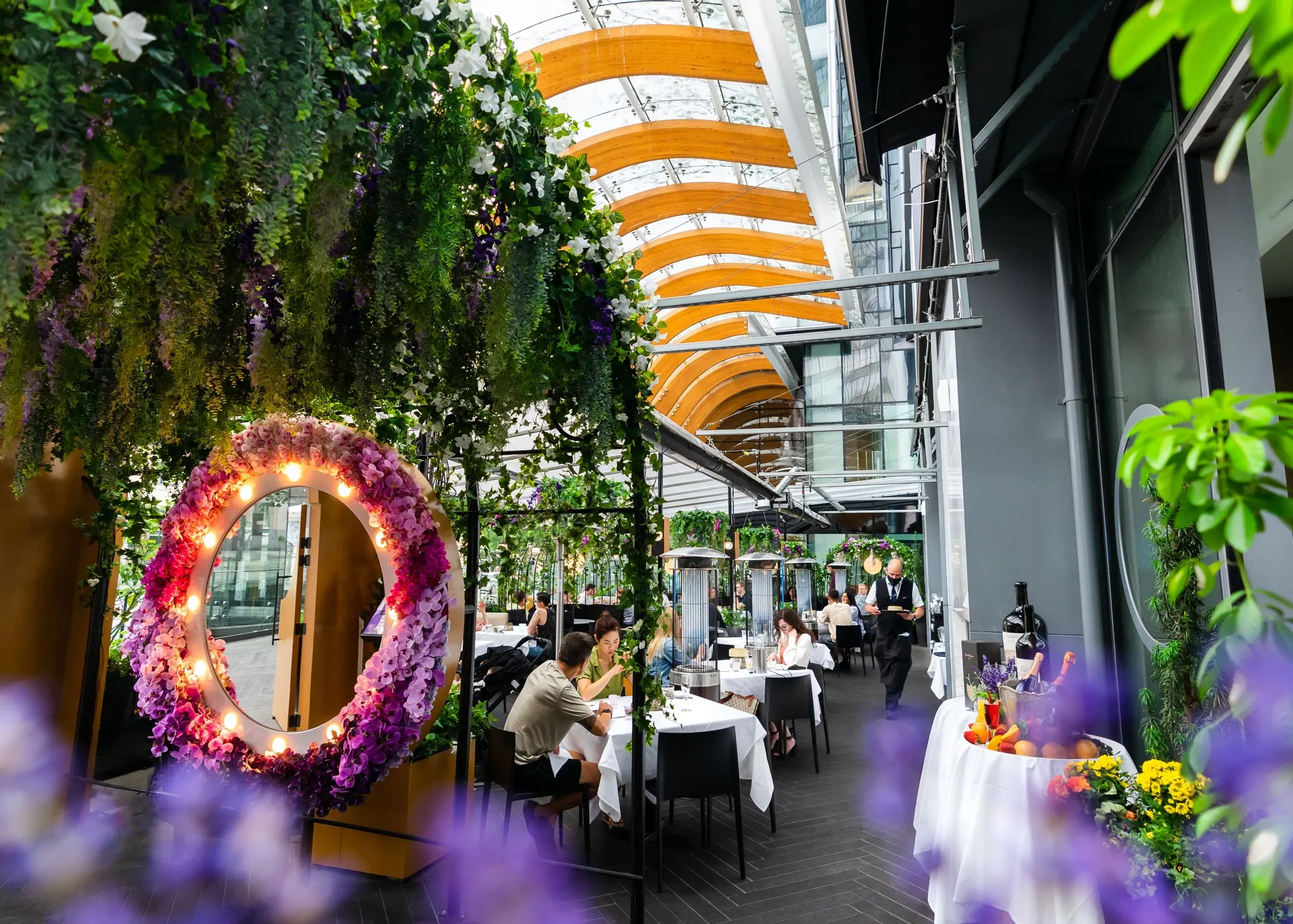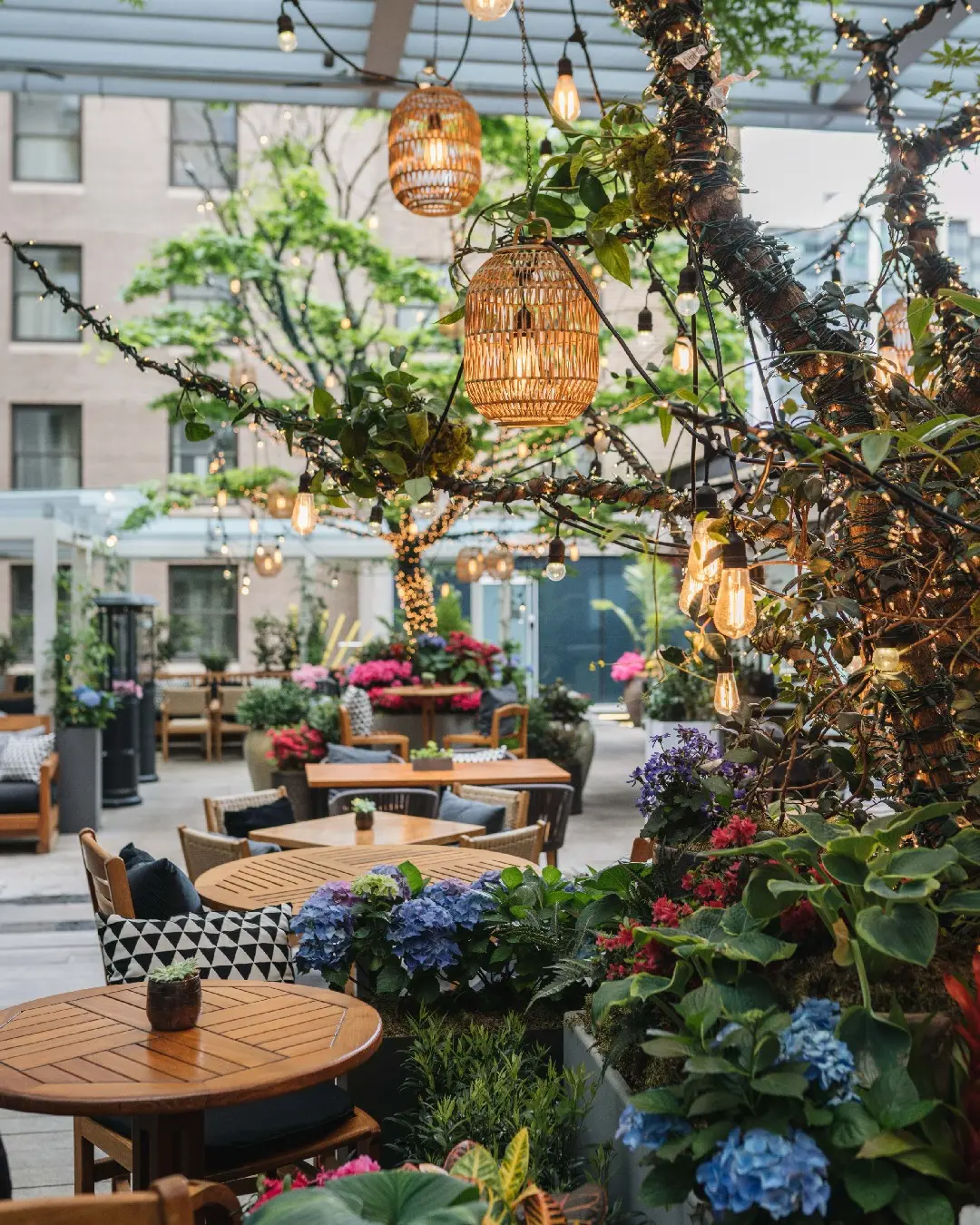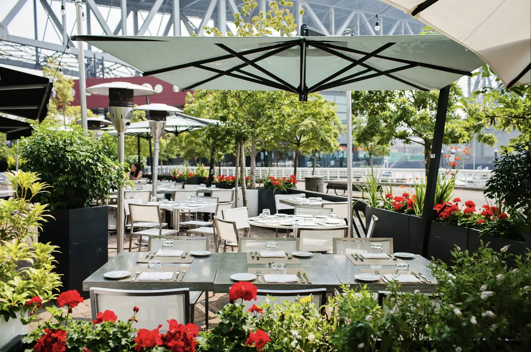 The Glowbal Restaurant Group does everything in a big way—and their patios are no exception. Standouts include the Roof at Black + Blue and the elegant al fresco setting in front of Italian Kitchen. Glowbal has a garden-themed patio festooned with floral and greenery decorations and filled with bird cage seating for intimate group gatherings. Food is sure to satisfy, with offerings like wagyu striploin with Yukon Gold pomme purée, seasonal vegetables, and veal jus, their signature truffled spaghetti and meatballs, and Maple Hill Farms roasted half chicken with popcorn and cauliflower purée, confit onions, spring peas, hazelnuts, and bacon.