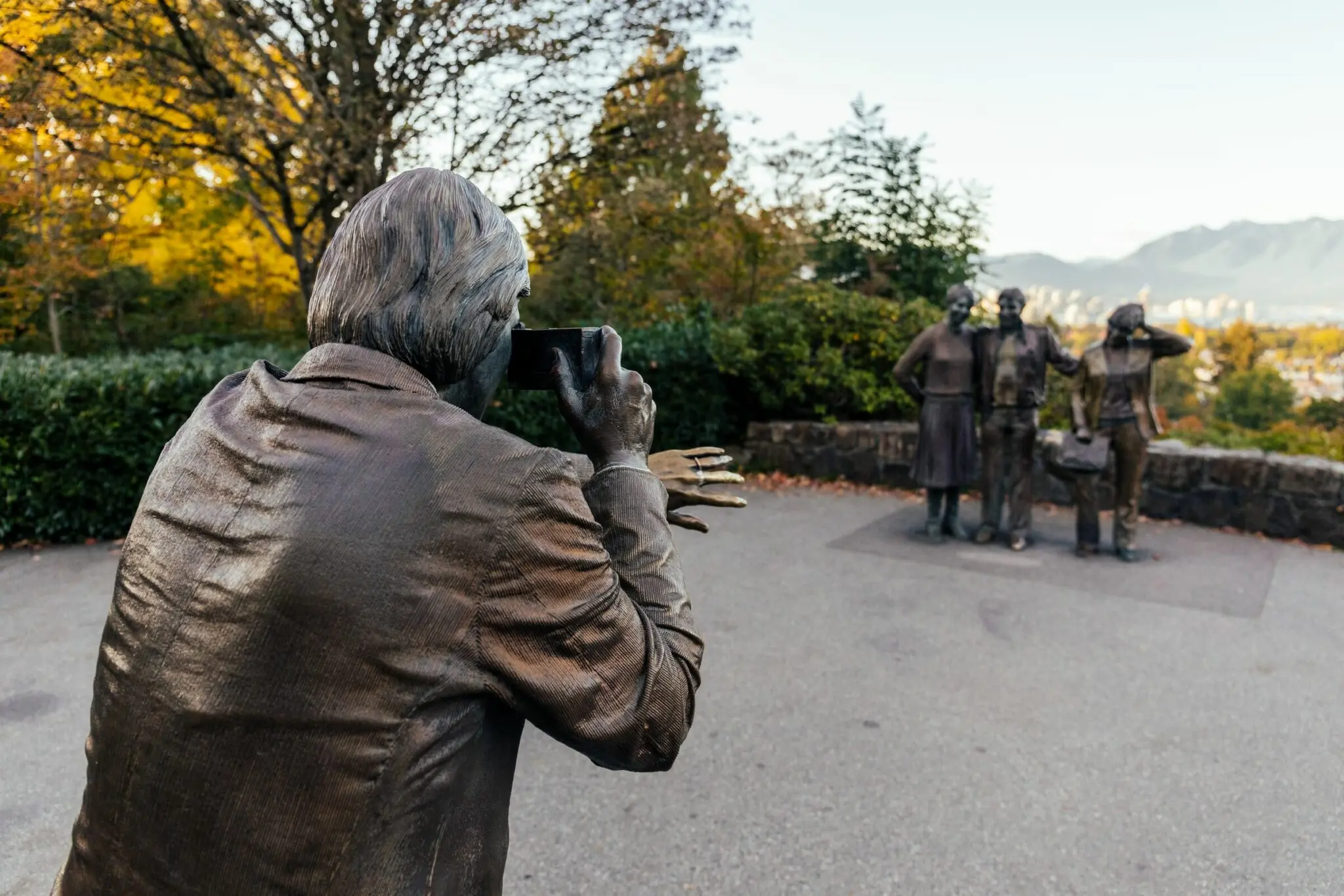 Another must-visit scenic location, Queen Elizabeth Park is found on Little Mountain roughly at Cambie Street and West 33rd Avenue. The Park offers an abundance of activities, including tennis and pickleball courts, a pitch and putt golf course, and the Bloedel Conservatory. The Park is beautiful, featuring a rose garden, quarry gardens, sculptures, a fountain, and an arboretum. A restaurant, Seasons in the Park, serves West Coast fare, with a patio that offers stunning views. The restaurant is a great place for taking a photo of the Park, the mountains, and the city, but another ideal spot is next to statues by J. Seward Johnson, Jr., which fittingly portrays a photographer taking a pic of 3 people. They’re found between the Conservatory and Seasons in the Park.