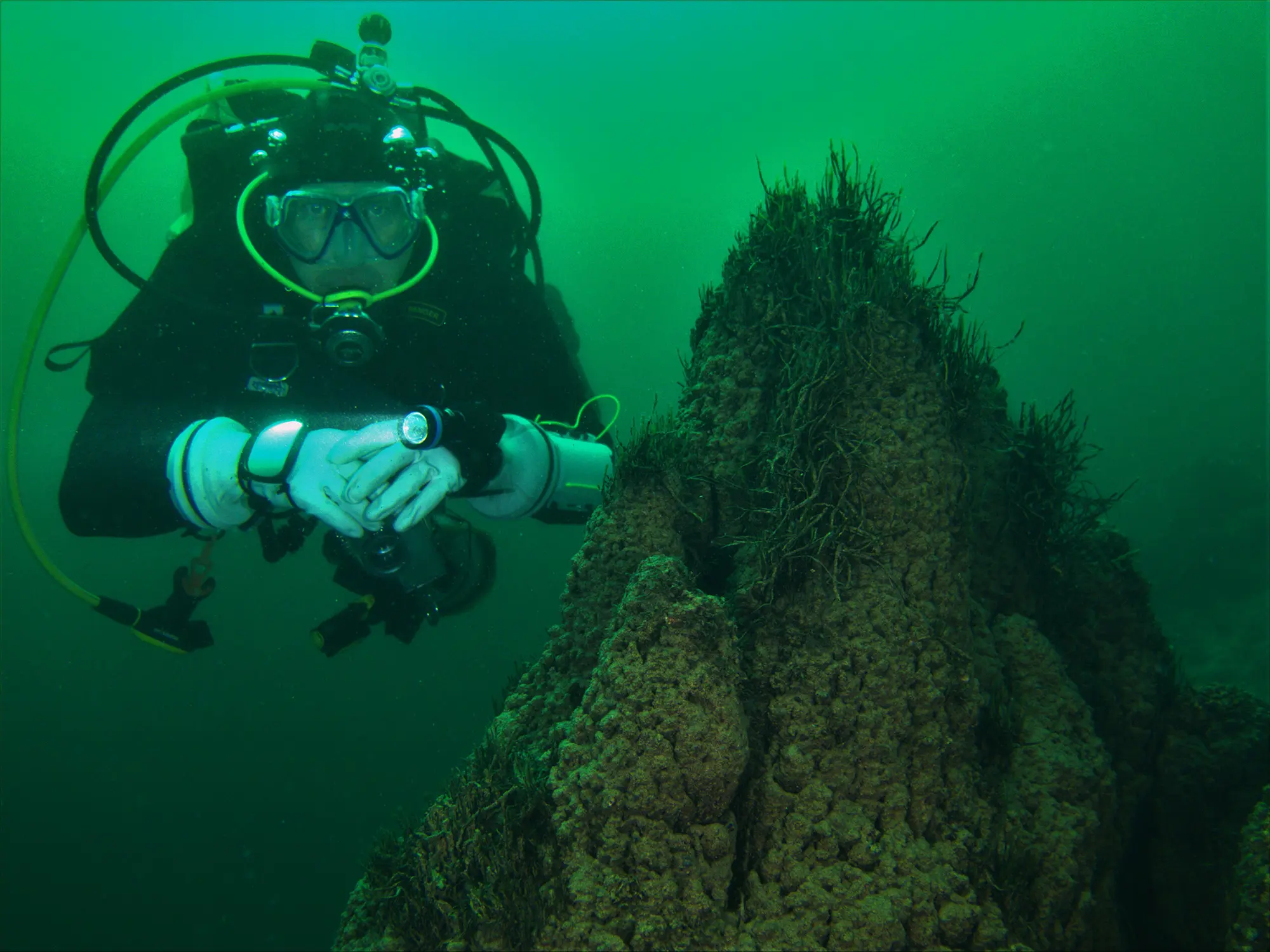 My dive buddy Zoltan and I had an opportunity to dive Pavilion Lake in early October. It is a protected environment and access for recreational divers is restricted to certain parts of the lake. Good buoyancy skills are a must and, of course, the microbialites are strictly hands-off.