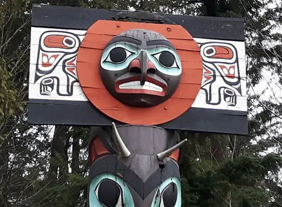 Although each pole is unique and special in its’ own way, I found myself transfixed by the Chief Skedans Mortuary Pole. Perhaps I was inspired by my recent visit to Haida Gwaii. Carved by Bill Reid, this stunning work is a replica of the Mortuary Pole initially raised in the village of Skidegate in the 1870’s. Honouring the Raven Chief of Skedans the pole depicts the hereditary crests of the chief. At the top of the original pole, a rectangular board covered a cavity that held the Chief’s remains in a burial box, hence a mortuary pole. Examining the piece in detail, I could clearly see the moon, a Mountain Goat, Grizzly Bear and a Whale.