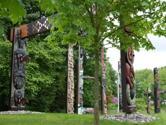 Recognizing the absence of work representing local First Nations, the Vancouver Parks Board commissioned Susan A. Point from the Musqueam First Nation to create a piece for the Brockton Point site, and People amongst the People was born. Designed as a series of three welcoming portals the installations represent the traditional Coast Salish slant roof style of architecture, with carved figures in the doorways.