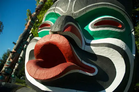 Standing in silence, gazing up at the magnificent Totem Poles located in the heart of Stanley Park, I was thankful for the chilly, misty day. The moody weather served to keep the crowds away, and I found myself alone amongst the poles at Brockton Point. Easily one of our city’s most frequented tourist attractions, it is extremely unusual to be standing solo amongst these magnificent, historical pieces. Masterfully crafted, each intricate pole tells a unique and compelling story. Captivated, I took my time and carefully studied the poles.