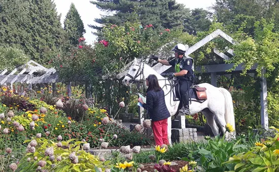 These well-tended flower beds attract aspiring gardeners from around the world. I was thrilled to find the park packed with city residents and tourists, all enjoying the dazzling display of colour. Young moms pushed strollers; toddlers ran on the grass and couples walked arm in arm. Passionate photographers worked to capture a bride and groom in all their glory, and just when I thought it couldn’t get any better one of Vancouver’s finest trotted through on horseback. Our local Police Mounted Unit regularly patrols the trails in Stanley Park, and today I was thrilled to observe one of our officers greeting visitors and patiently offering directions.
