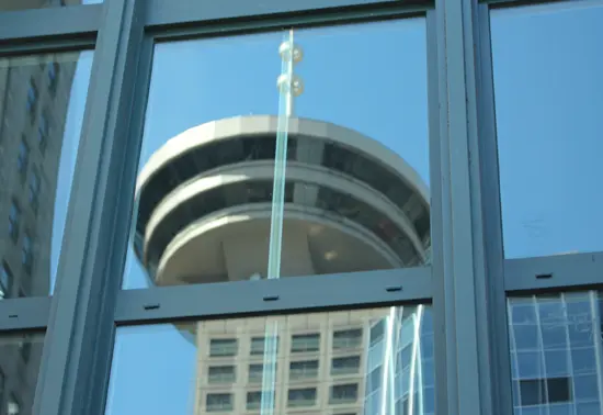 I took my gaze upwards, towards the modern glass skyscrapers that embody downtown. Instantly, I began to see these massive buildings in a different light. My new perspective had me observing the “concrete jungle” with a renewed sense of purpose. Before me lay a glass gallery, an impressive, surrealistic, outdoor gallery that presented new works of art almost by the minute. Images of clouds, buildings, and people were playfully presented and distorted. Colours were continually changing, reflecting the mood of the moment.