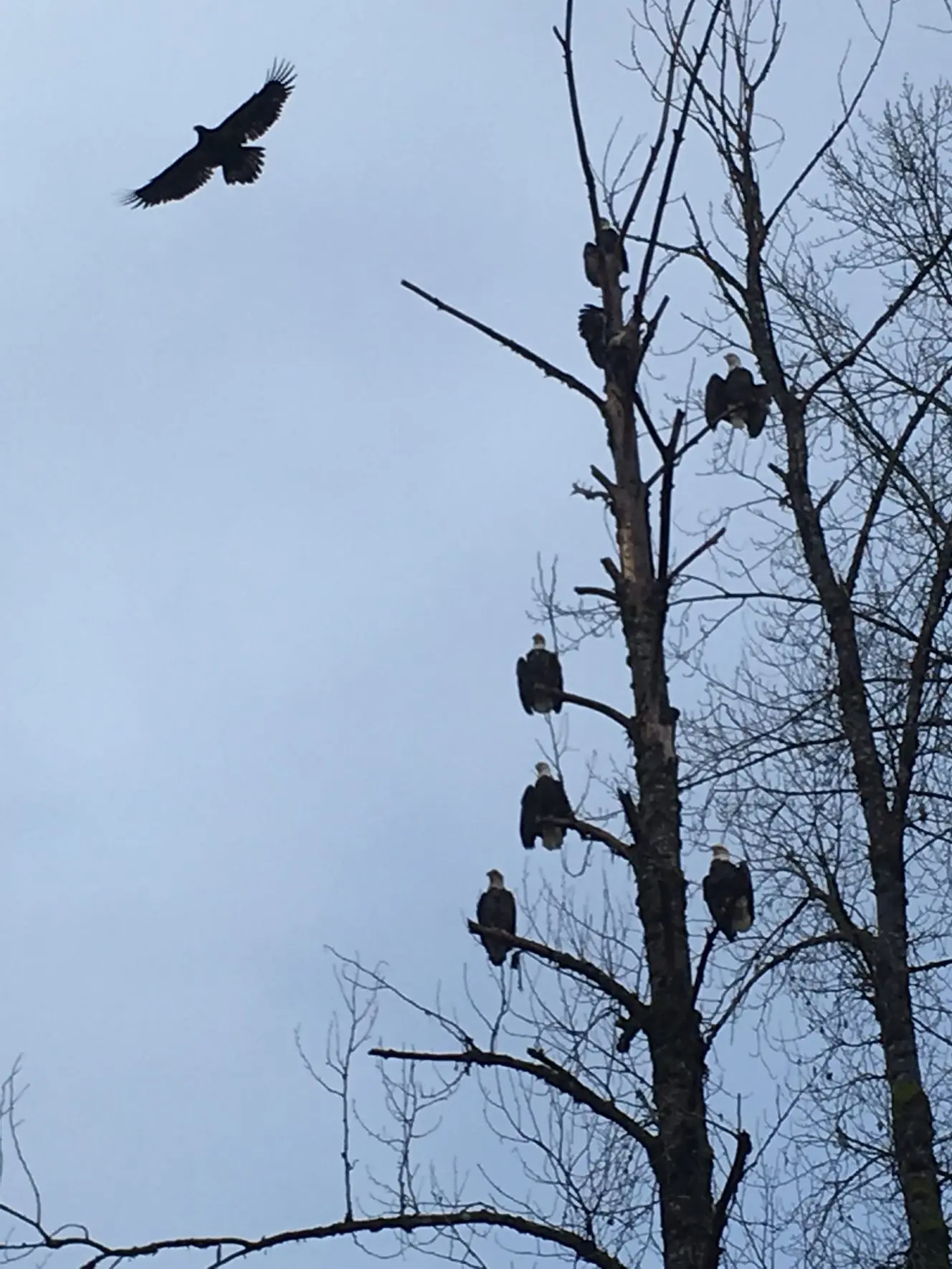 At first, the eagles were somewhat scarce—Jordan was a little worried we would see some but not hundreds of birds. Happily, as we neared the final leg of the trip, we found ourselves in eagle-watching nirvana. The birds were everywhere, primping, preening and standing guard on bare branches. We saw fully mature as well as juvenile eagles. Hunting hours are mornings and evenings, according to Jordan, so we didn’t see much diving. But we saw quite a few take off and glide the air currents.