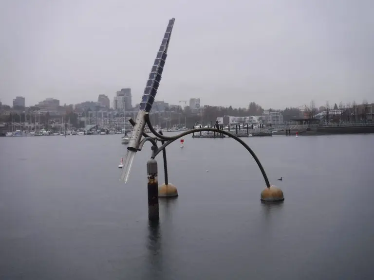 Hardpressed to pick a favourite, I did find myself captivated by Buster Simpson’s Brush with Illumination. Located in the water off David Lam Park, this unique interactive sculpture resembles a calligraphy brush. Designed to respond to environmental changes, the massive installation rotates and rocks with the tides, winds and waves. In constant motion, the structure also serves as a solar-powered data-gathering apparatus. Captured data is transmitted wirelessly to shore and logged via the internet where viewers can log in and enjoy an ongoing movie of linked images and sounds centered around a sundial presentation. This unique combination of art, environment and science was fascinating and thought-provoking. Truth be told, my rainy day walk gave me a deeper appreciation and understanding of our kinship with the sea.