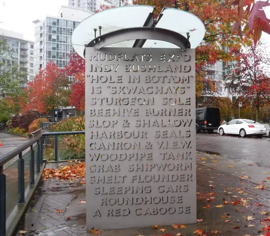 Because of the dreary weather, I was virtually alone on the seawall. Bundled up in my rain gear, with time on my hands, I seized the opportunity to partake in a self-guided Yaletown Walking Art Tour. Although I have travelled this circuit on countless occasions, I must confess that I have never really spent time observing and appreciating the public art installations. Shame on me! From “Time Top” to “Welcome to the Land of Light”, these brilliant pieces capture the area’s natural and industrial history and explore our deep connection to the sea and the changing tides of False Creek.