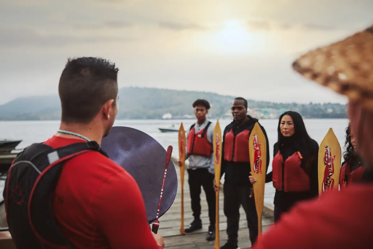 For the interpretative paddling, the experience begins in picturesque Whey-Ah-Wichen. After a traditional greeting and then safety instructions, guests embark on a journey on the waters of Burrard Inlet in canoes that are replicas of the cedar dugout ones historically used by the Tsleil-Waututh. Guests visit ancient village sites, soak up the gorgeous scenery, and listen to songs and legends.